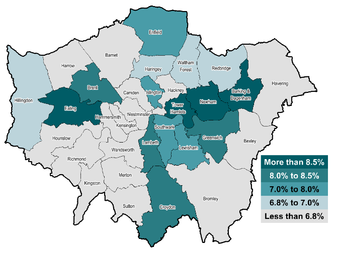 In Richmond, the City of London, Kensington en Chelsea hebben inwoners gemiddeld inkomen £100,000. Het gemiddelde inkomen in Newham per jaar is £ 12,500. dat is dus een groot verschil van £87,500.